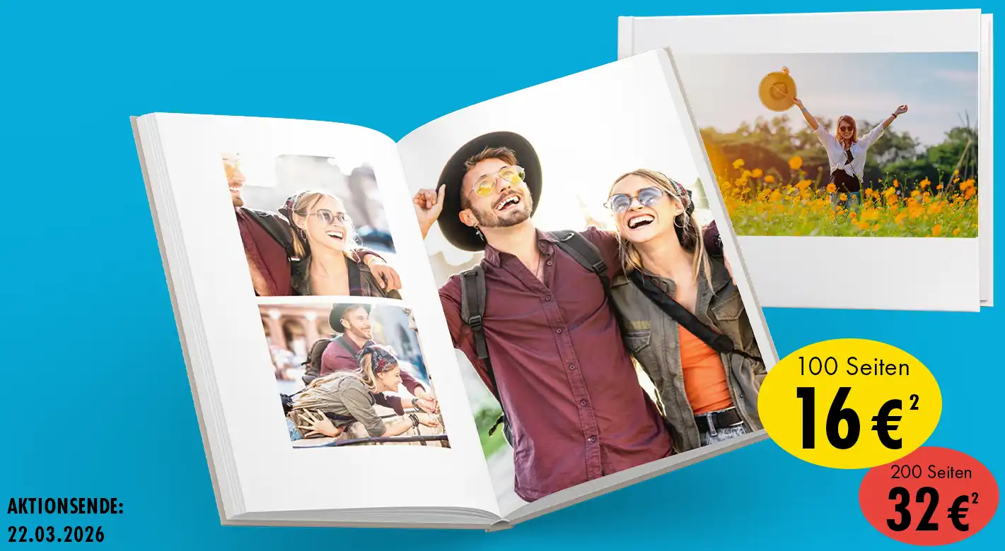 ² Fotobuch Hardcover A4, Digitaldruck Glanz, Hoch- & Querformat: 24 - 100 Seiten: pro Buch nur 16 € statt regulär max. 58,95 € | 102 bis 200 Seiten: pro Buch nur 32 € statt regulär 96,95 €. Das Fotobuch im Querformat gibt es produktionstechnisch nur mit max. 156 Seiten. Aktionszeitraum: 16.02. bis 22.03.2026. Alle Preise inkl. MwSt., zzgl. 4,99 € Versand. Auch über die ORWO FOTO-App bis 100 Seiten bestellbar.