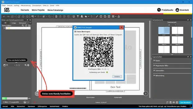 Ab Version 6.4 kannst du deine Fotos direkt vom Smartphone in den ORWO Foto Designer (Desktop-Version) hochladen – ganz ohne Kabel oder manuelles Zwischenspeichern. Für den Upload wird lediglich kurzzeitig eine Internetverbindung benötigt. Sobald deine Bilder übertragen sind, kannst du wie gewohnt offline weitergestalten.